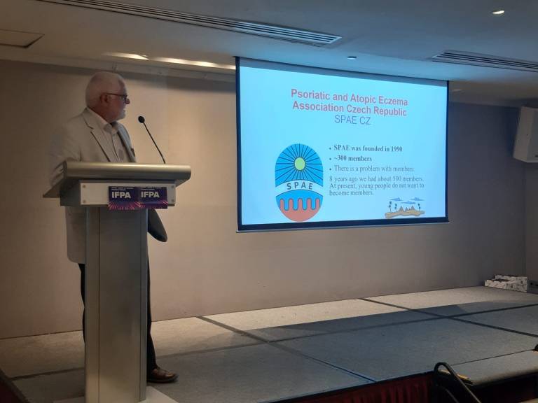 Tento mítink byl zaměřen zejména na organizace a jejich činnosti, pocházející z Asie. Součástí bylo také představení dvou desítek ostatních členských organizací, co dělají, jak fungují, co se v minulosti povedlo a co plánují do budoucna. Tak jsem představil i já naši organizaci SPAE, přestože jsem si vědom, že za více jak 15 let našeho působení v IFPA jsme již dostatečně ve světě známí svými činnostmi. A navíc se vloni k našemu českému pojetí “oslav” Světového dne psoriázy (též WPD, připadá na 28. října) v minulosti přidalo (krom jiných) i Japonsko, kde v duchu Puntíkového dne nasvítili celou Tokijskou věž - a o tomto počinu též japonští delegáti referovali. Hlavní zaměření konference bylo v přípravě na letošní WPD a o tom, aby se kladl důraz na to, že psoriáza je nenakažlivé a nepřenosné onemocnění, aby to bylo známo po celém světě, jak to bylo deklarováno již na 69. zasedání Světové zdravotnické organizace v r. 2014. A také jsme se zaměřili na to, jak pomoci, aby měli pacienti přístup k odborné léčbě, což se ne všude ve světě daří (zejména v chudých zemích je problém nejen finanční, ale i s lékaři, kde např. dvacet dermatologů připadá na 40 mil. obyvatel). Josef Pohůnek, prezident SPAE