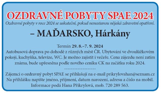 Na ozdravné pobyty SPAE pro rok 2024 se můžete přihlásit u paní Hany Přikrylové :