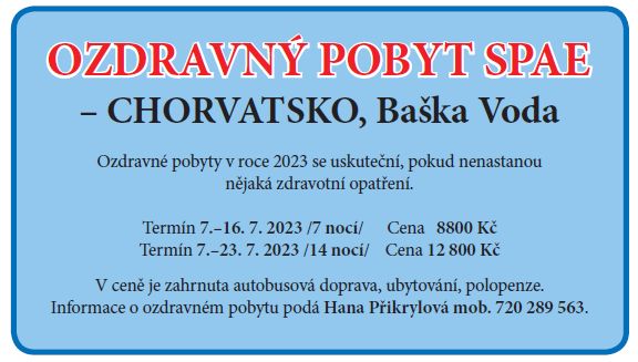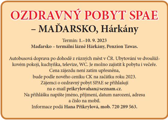 I v roce 2023 pořádá SPAE ozdravné pobyty v Chorvatsku - Baška Voda ( 7.7. - 23.7.) a do termálních lázní v Maďarsku - Harkány (1.9. -10.9.) Zájemci o ozdravný pobyt se přihlašují na e-mail prikrylovahan@seznam.cz a více informací Vám podá Hana Přikrylová , mob.720 289 563