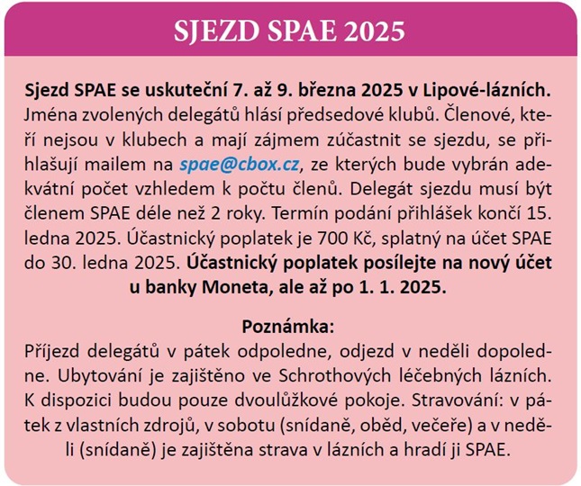 Sjezd SPAE se uskuteční v termínu 7 - 9.března 2025 v Lipové-lázních. Mezinárodní výstup na Portáš 13 - 15. června 2025.