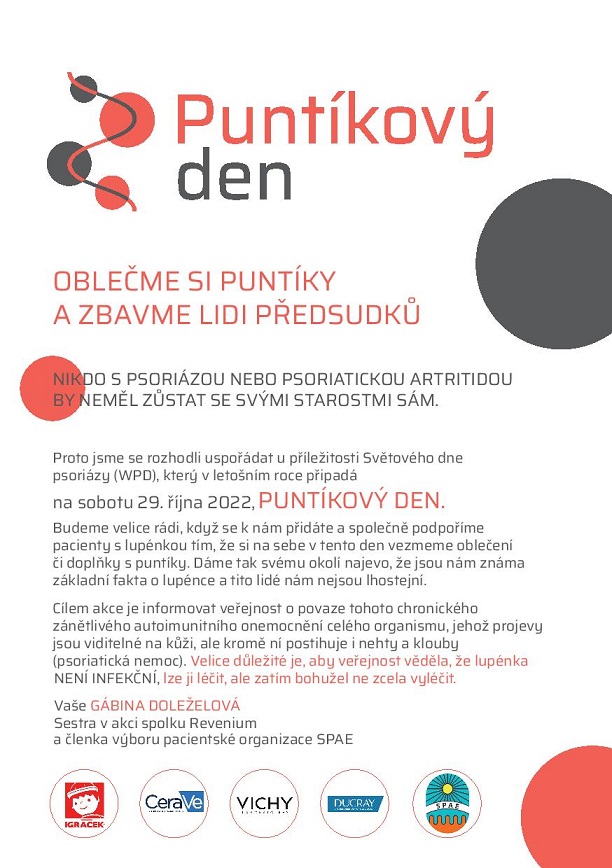Podpořme pacienty s lupénkou a oblečme se v sobotu 29.10.2022 do puntíků u příležitosti Světového dne psoriázy ( WPD). Na náměstích, návsích, hřištích, školních dvorech se chytněme za ruce a udělejme jeden VELKÝ LIDSKÝ PUNTÍK - kruh z nás, lidí s puntíky. Dejme tak ostatním najevo, že dobře víme, že lupénka (psoriáza) není infekční!